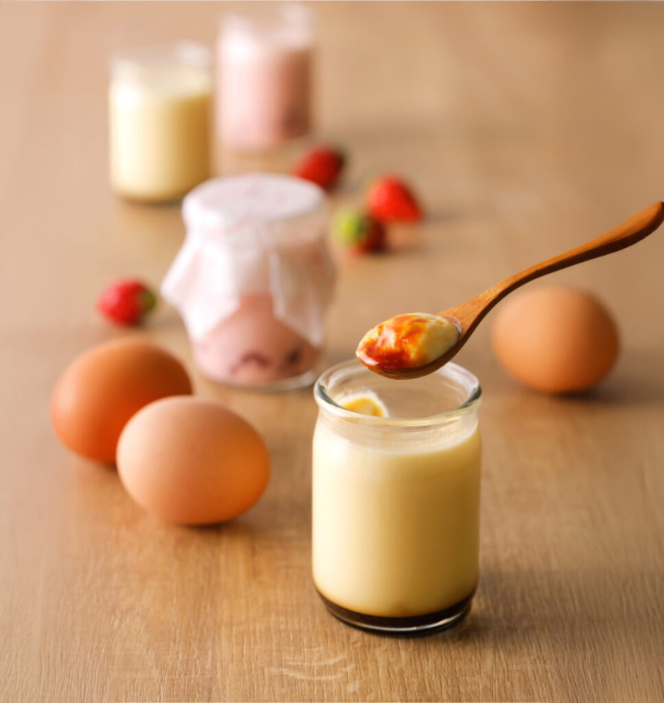 北海道産の生クリームと卵を贅沢に使用し、低温でじっくり焼き上げることで、口どけのよいなめらかな食感を実現しました。甘さは控えめで、ほろ苦いカラメルソースが全体を引き締めます。